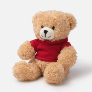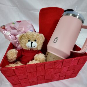 Cesta de San Valentín formada por: Cesta de tela roja con estructura metálica, oso de peluche con sudadera roja personalizable, Taza termo o botella rosa Runbott personalizada, manta roja de forro polar (medidas 120x150cm de 180gr) con frase personalizada, golosinas para endulzar el día.