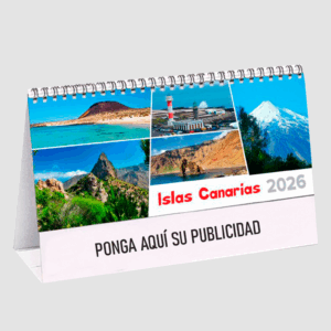 Calendario de sobre mesa: formado por 7 páginas impresas a doble cara y todo color, con imágenes de paisajes canarios. Incluye cambios de hora, inicio de estaciones, festivos nacionales e insulares, y ciclos lunares. Formato 20×15 cm con bajo personalizable.