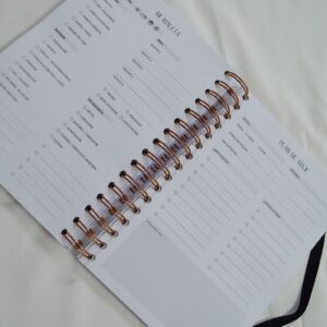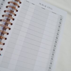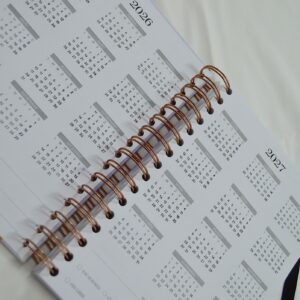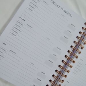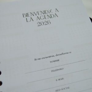 Contenido del interior:  Información personal, Calendario anual 2026 y 2027, Vision Board, Cumpleaños, Horarios, Objetivos mensuales antes de cada mes, Planning mensual, Vista semanal, Balance financiero mensual, Plan de viaje y mi maleta, 18 páginas de Notas,  Marcapáginas y Bolsillo de almacenamiento.