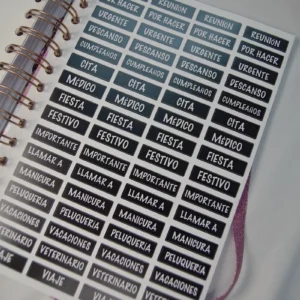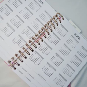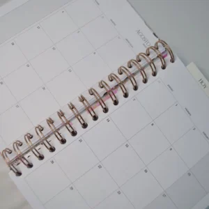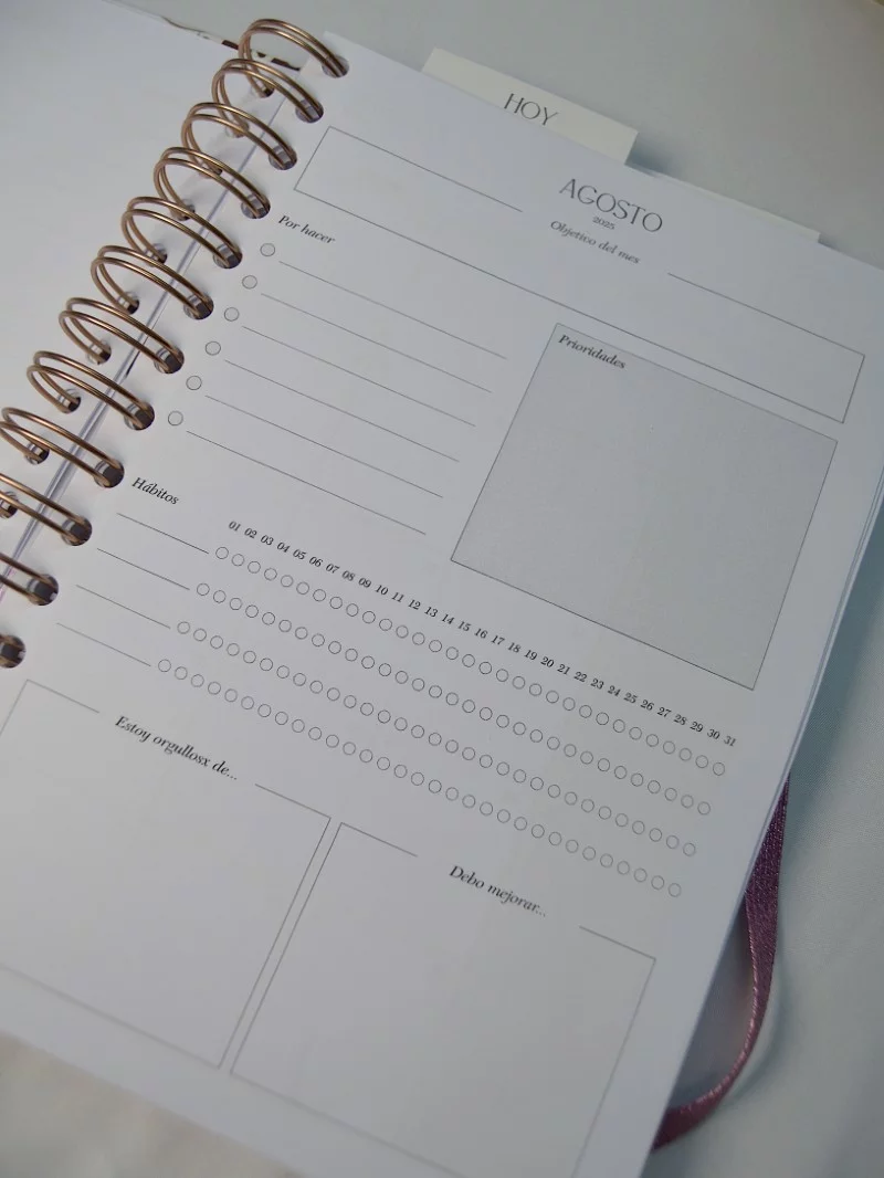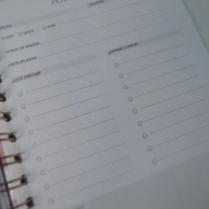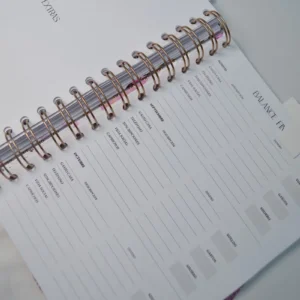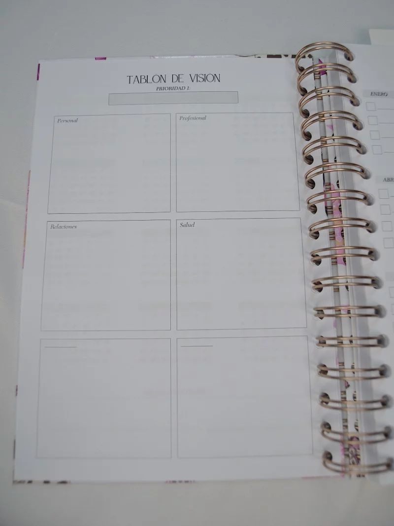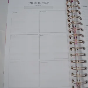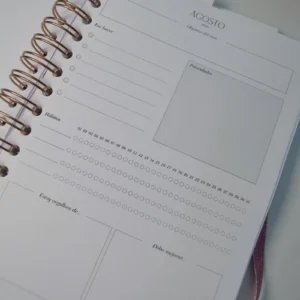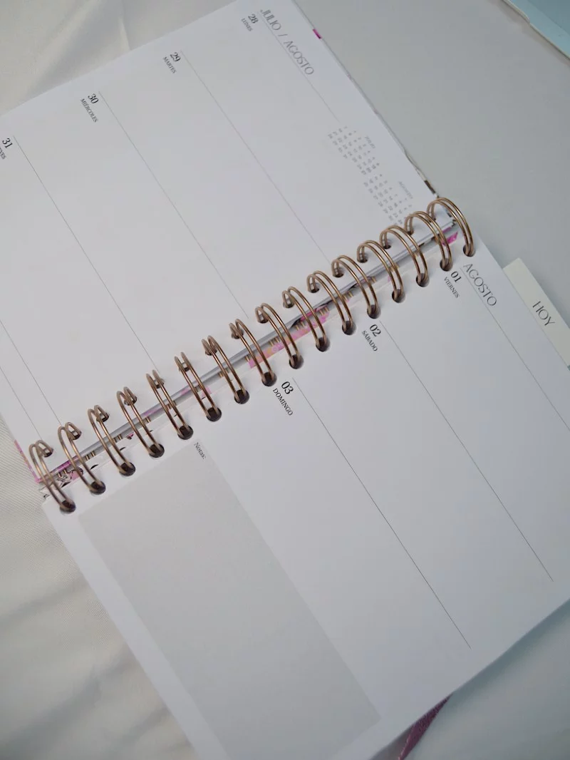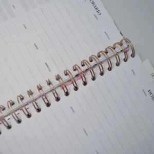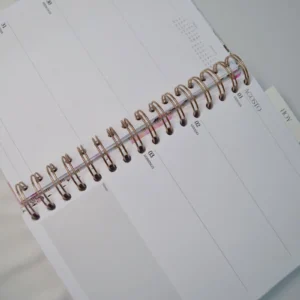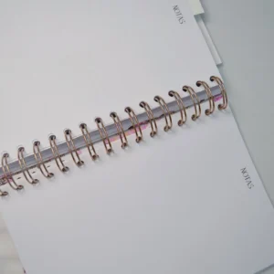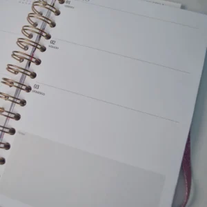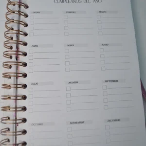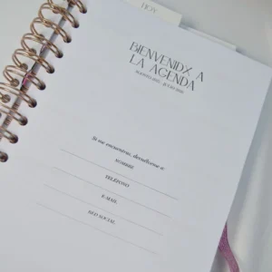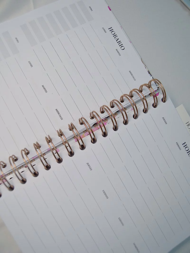 Características: Tamaño A5 terminada en Wire-o (para poderla doblar cómodamente), tapa dura laminada con elástico de cierre (lo cual la hace ultra resistente), interior impreso sobre 90gr de vista semanal (resistente a subrayados y bolígrafos de tinta gel).