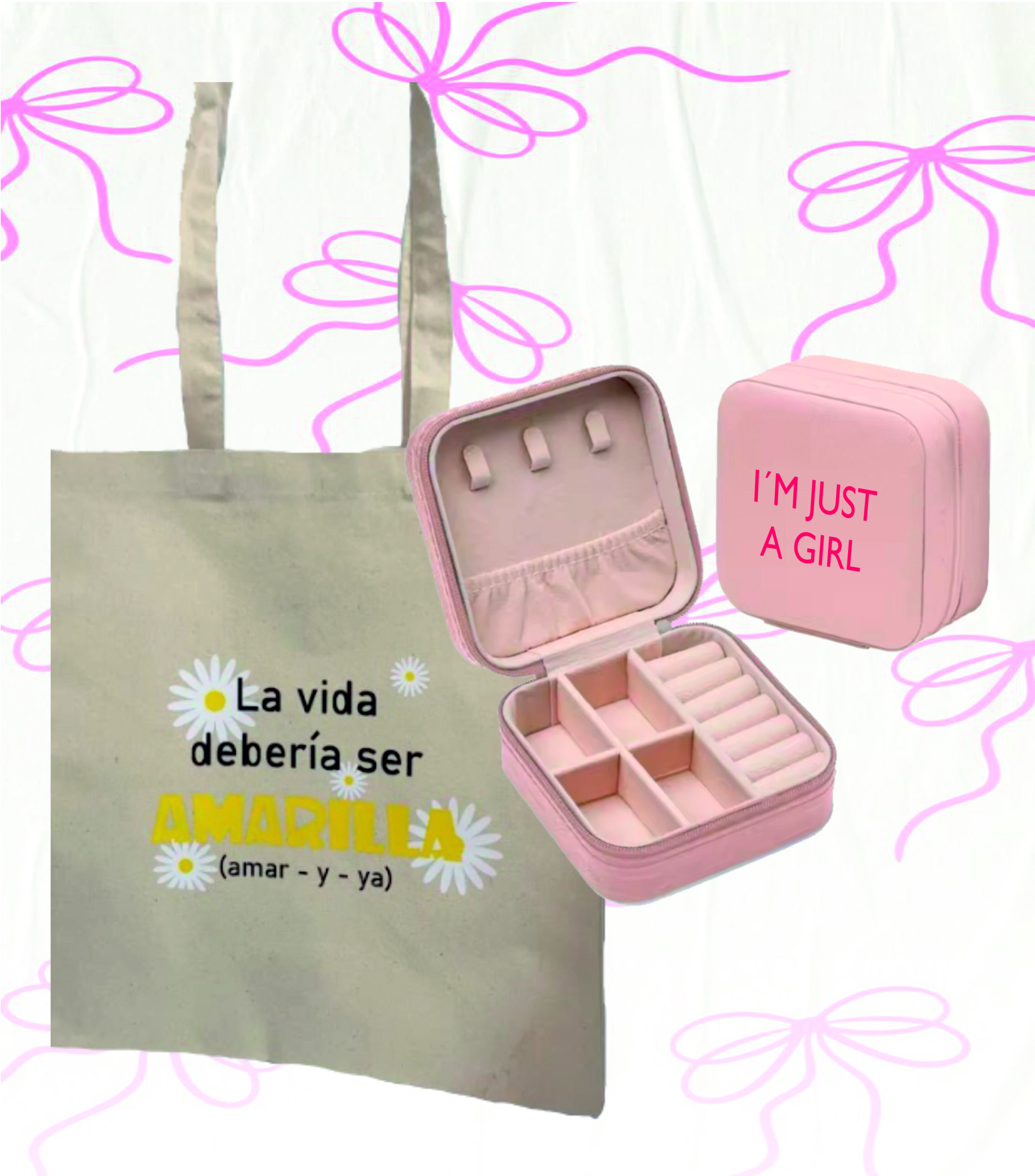 Contiene: tote bag a elegir entre 7 diseños y un joyero de viaje con cubierta personalizable.